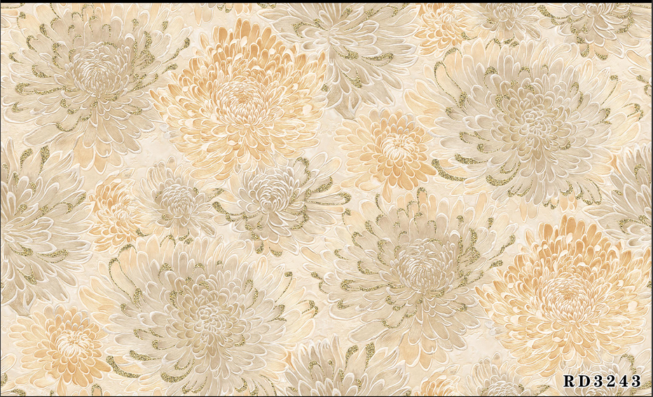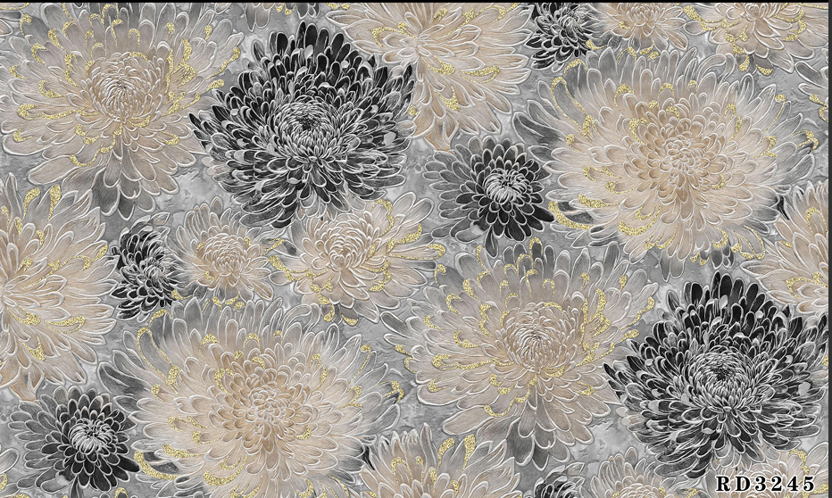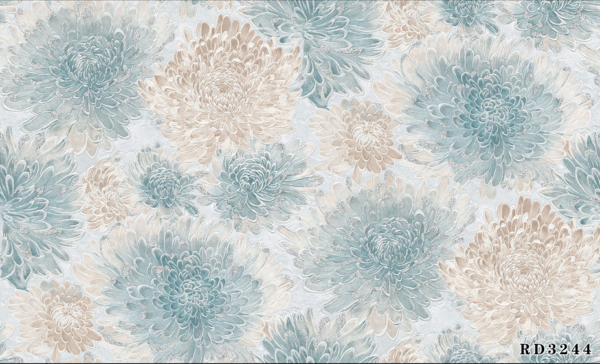 Bloom Aura wallpaper features lush, detailed chrysanthemum patterns in calming pastel blues, elegant creams, soft golds, and striking blacks, bringing life and sophistication to any space. This design creates a gentle yet vibrant statement wall, perfect for both modern and classic interiors such as bedrooms, living rooms, or lounges. The durable and easy-to-clean surface ensures long-lasting beauty, making Bloom Aura an ideal choice for stylish homes that want to showcase florals with a serene, contemporary flair