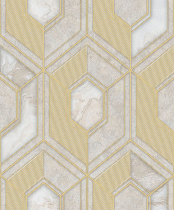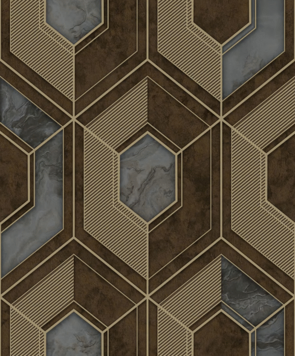 Hexa Style wallpaper features a bold geometric pattern with hexagon shapes, fine lines, and a subtle marble effect, giving any space a modern yet elegant touch. The design features a blend of deep, neutral, and gold tones, making it versatile for various interior styles, including contemporary, classic, and urban chic. Its structured lines and rich textures add depth and sophistication, perfect for accent walls in living rooms, bedrooms, or offices