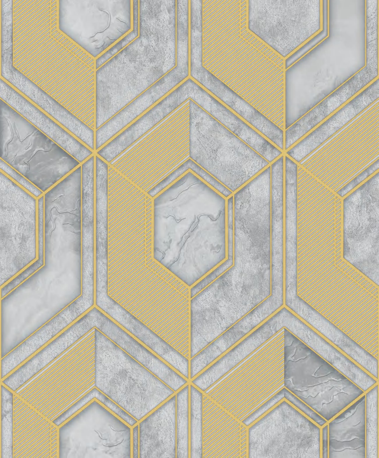 Hexa Style wallpaper features a bold geometric pattern with hexagon shapes, fine lines, and a subtle marble effect, giving any space a modern yet elegant touch. The design features a blend of deep, neutral, and gold tones, making it versatile for various interior styles, including contemporary, classic, and urban chic. Its structured lines and rich textures add depth and sophistication, perfect for accent walls in living rooms, bedrooms, or offices