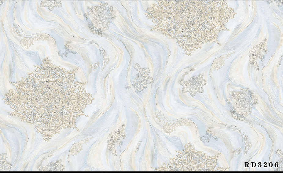 Royal Lace wallpaper features intricate lace-inspired gold patterns flowing over soft cream, white, and blue marbled backgrounds, creating an elegant and regal statement for any room. Perfect for living rooms, bedrooms, or dining areas, this wallpaper blends classic luxury with contemporary style to instantly enhance your walls while remaining easy to maintain and durable for daily use